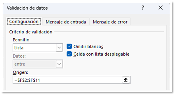 Desplegamos permitir, seleccionamos lista, y, en la ventana origen, seleccionamos los productos únicos.