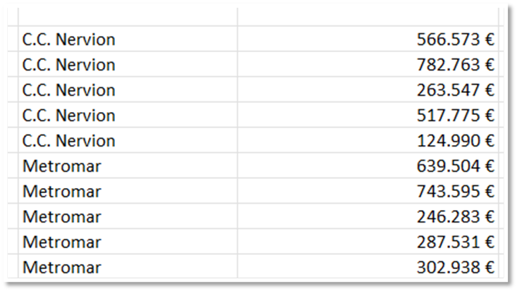Pero, no es lo que quiero, quiero que antes de cada total por producto, aparezca el nombre del centro comercial.