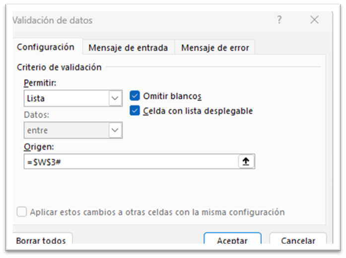 Creamos una validación de datos con los países, para ello, nos colocamos en la celda G6, donde vamos a crear la validación, vamos a la pestaña de datos, dentro del grupo nombres definidos, hacemos clic en validación de datos, desplegamos permitir, y, elegimos lista, y, en la ventana origen, seleccionamos la celda W3 junto con el operador de rango derramado (#).