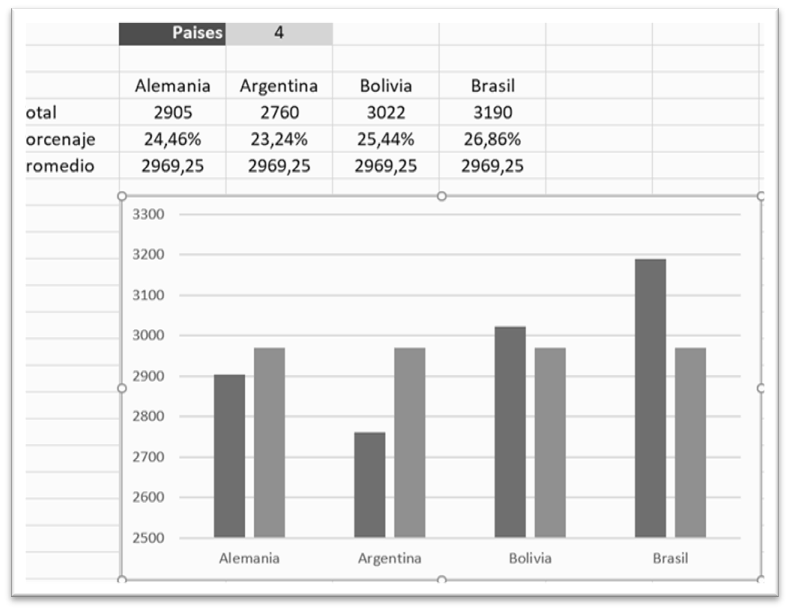 Este ejemplo, va a consistir en crear un gráfico dinámico, a través de una matriz dinamina creada previamente, en esa matriz, van a aparecer solo los países que elijamos a través de una validación de datos, y, debajo de ellos, aparecerán las ventas realizadas por esos países, y, el promedio de los países seleccionados.
